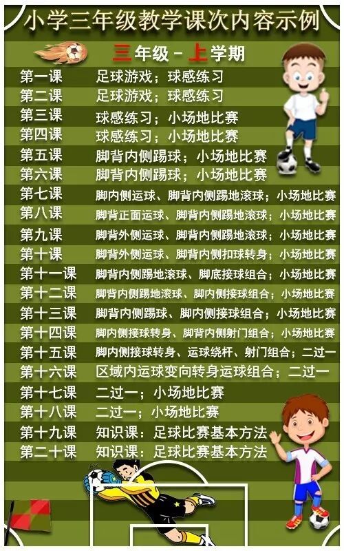 幸运地是,教育小新从教育部发布会散发的资料找到了这样一套课次内容规范标准——《全国青少年校园足球教学指南(试行)》。该《指南》具体全面的各年级每节足球课具体教学内容和指标,非常值得大家收藏。
