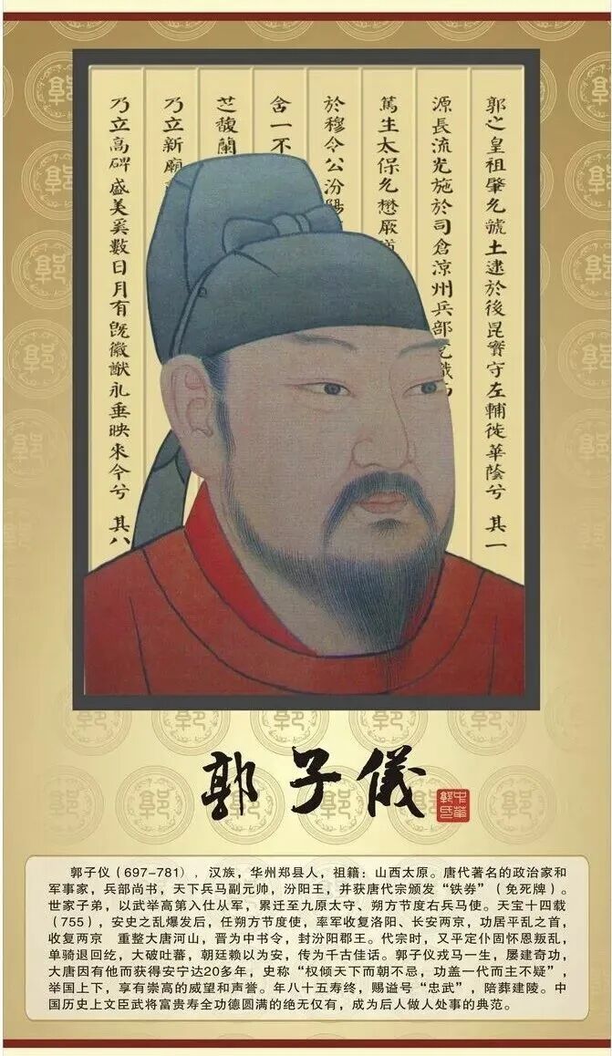 郭子仪历仕玄、肃、代、德四朝,官至太尉、中书令,封汾阳郡王。德宗即位,尊其为“尚父”。《旧唐书》载其“岁入官俸二十四万贯”,八子七婿皆位列显宦,可谓富贵寿考,千古难寻。